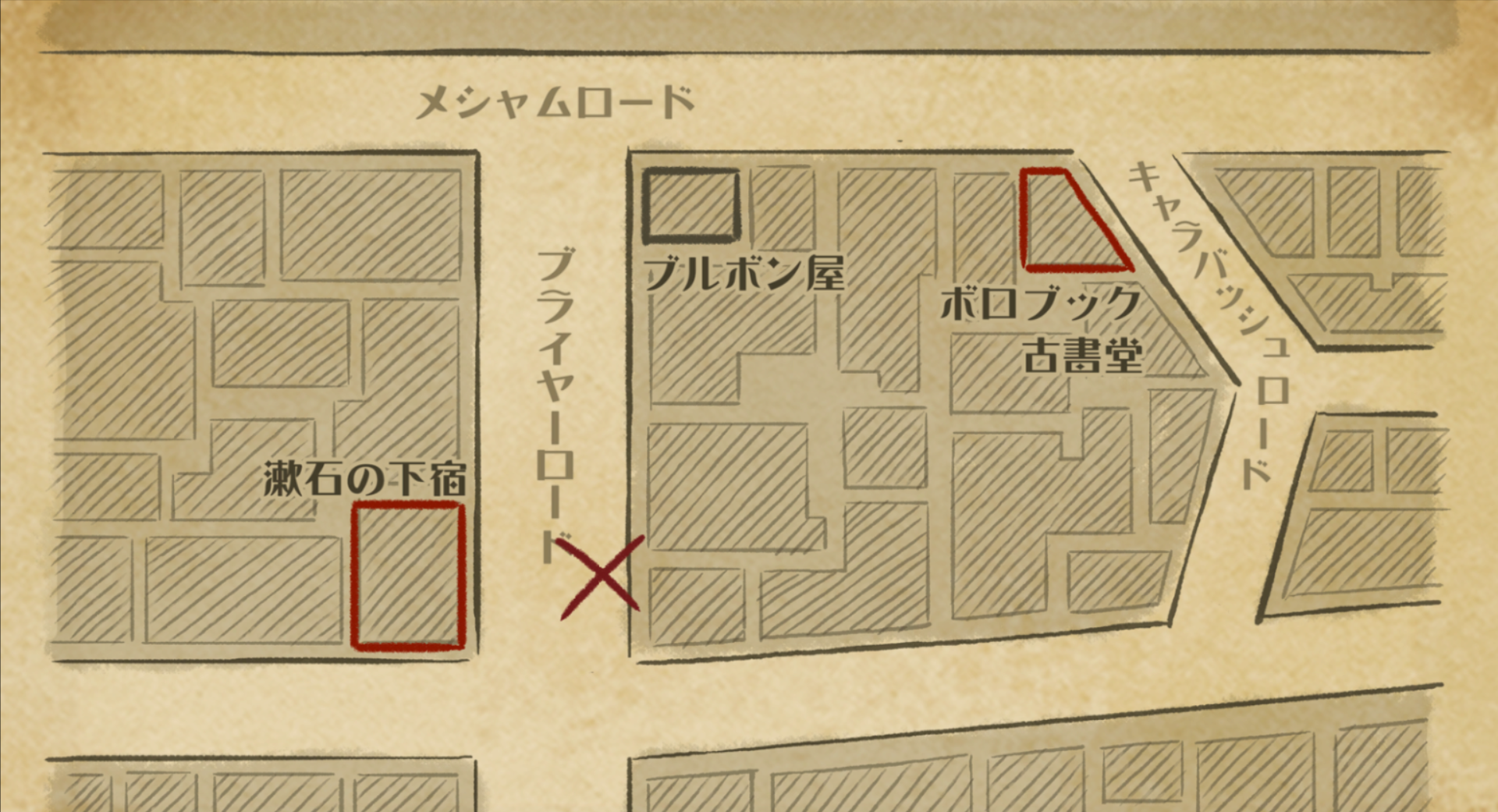 事件現場周辺の地図。事件に関連する情報が記されている。 |